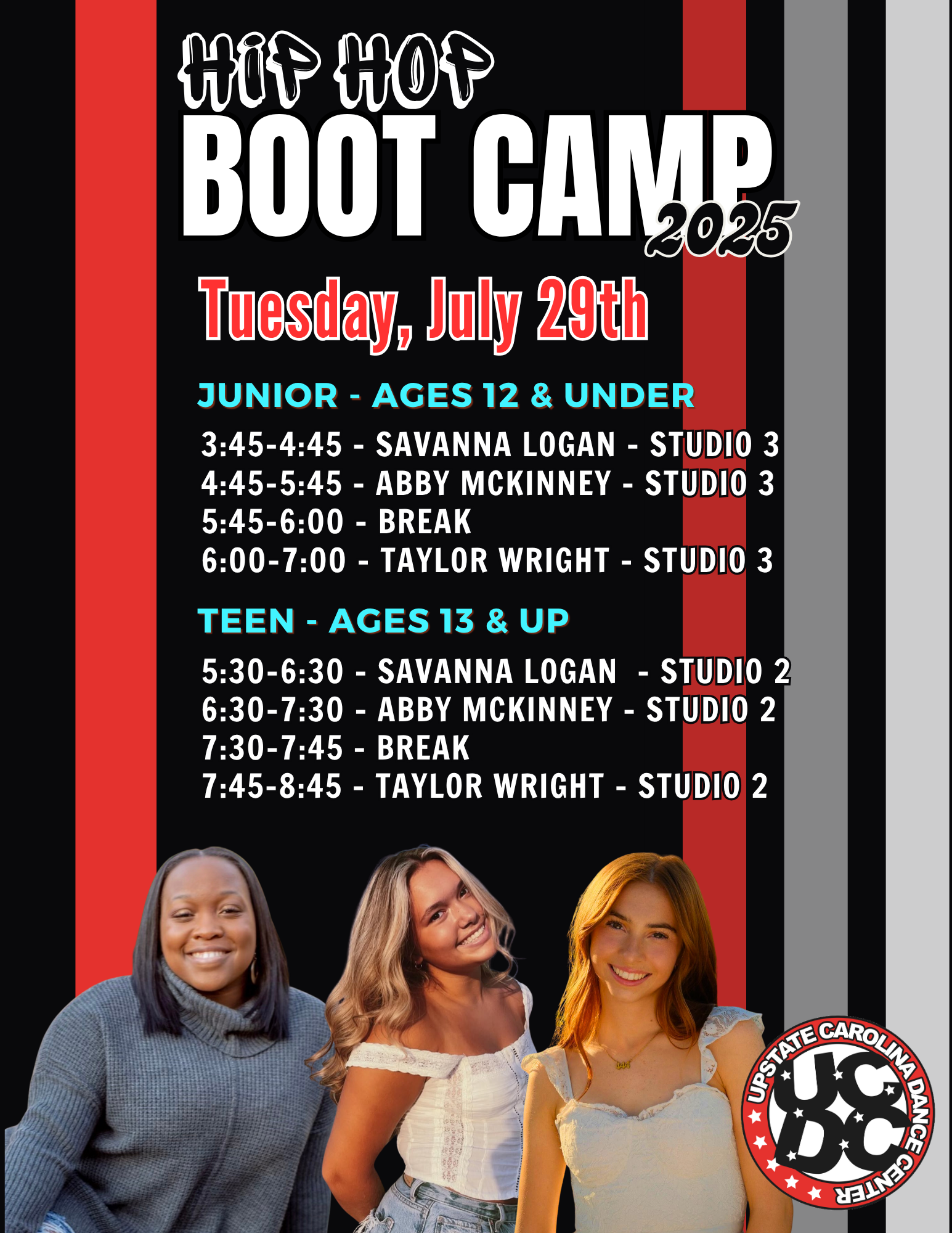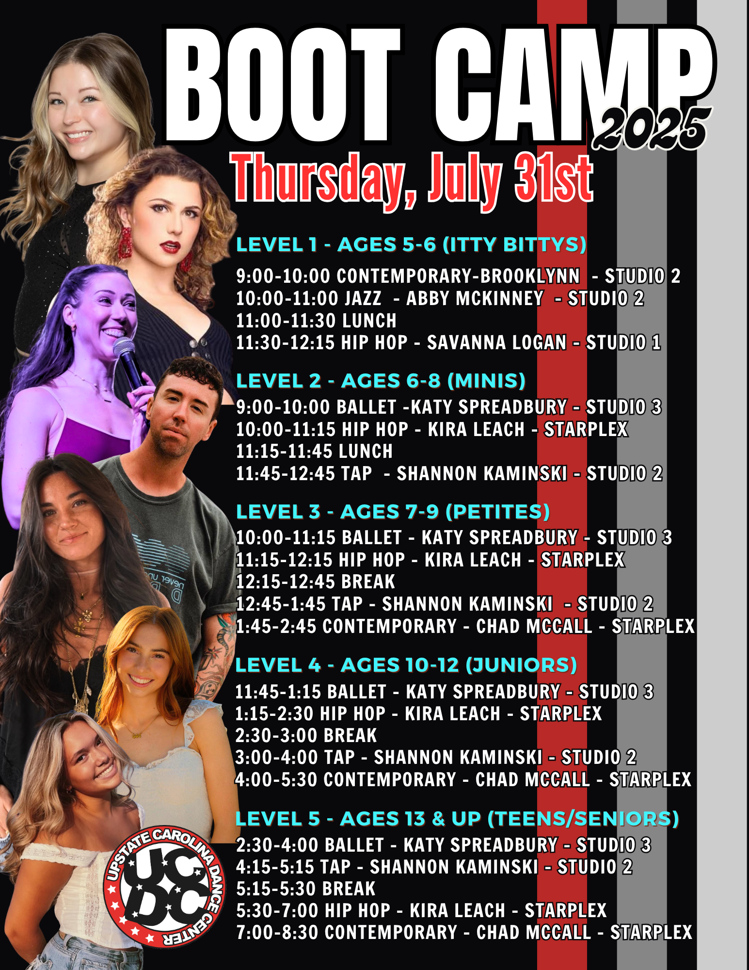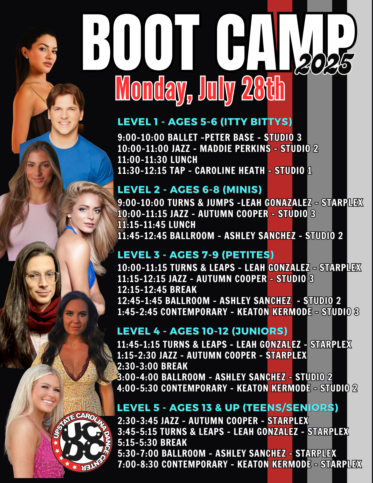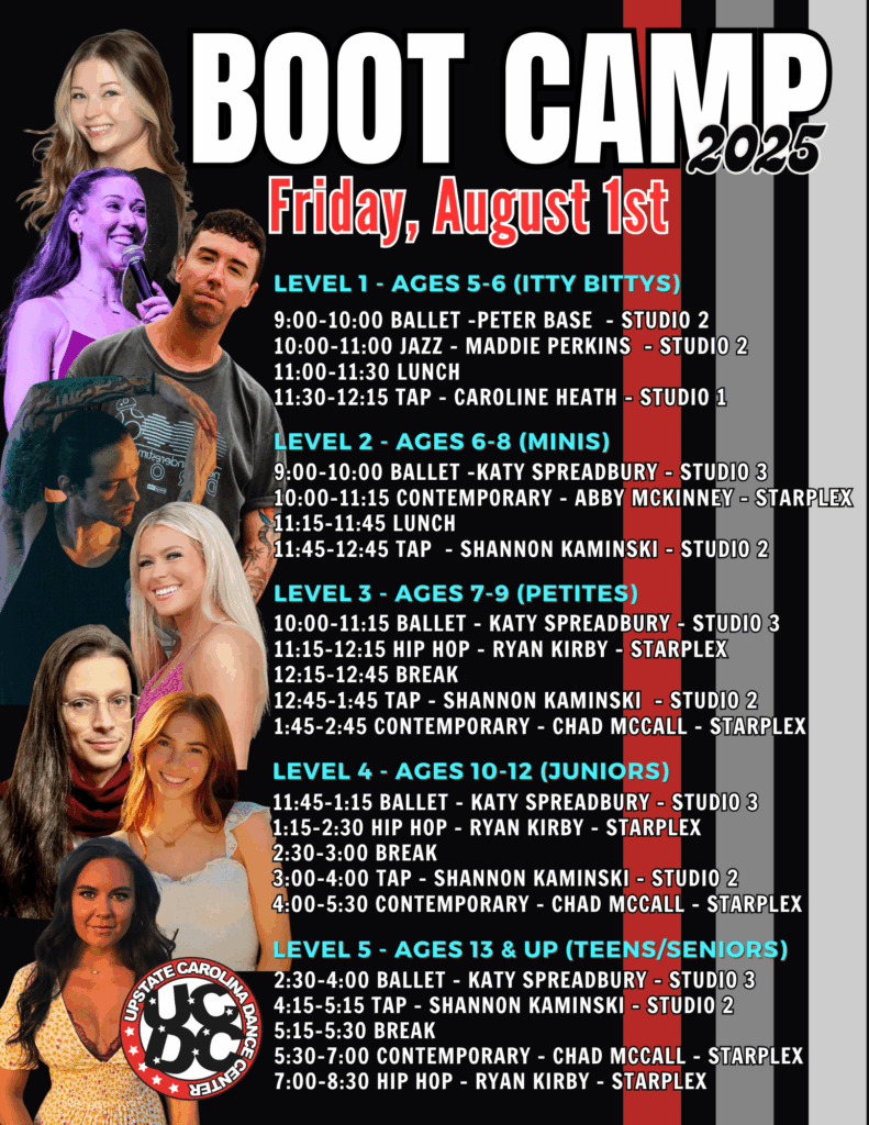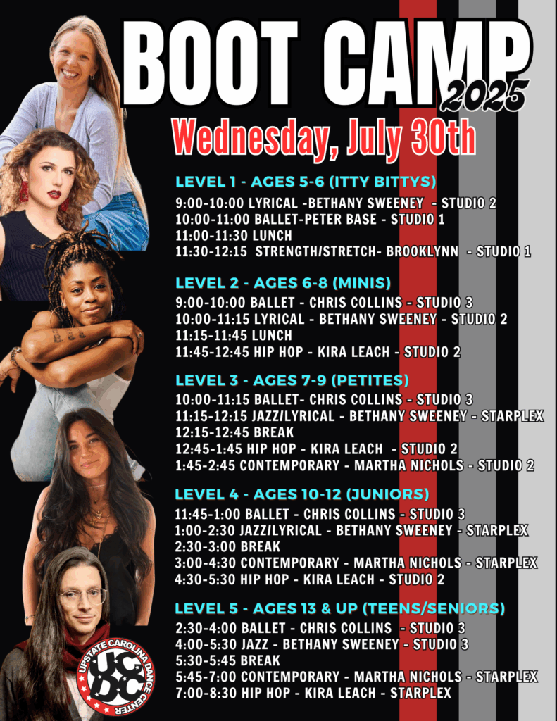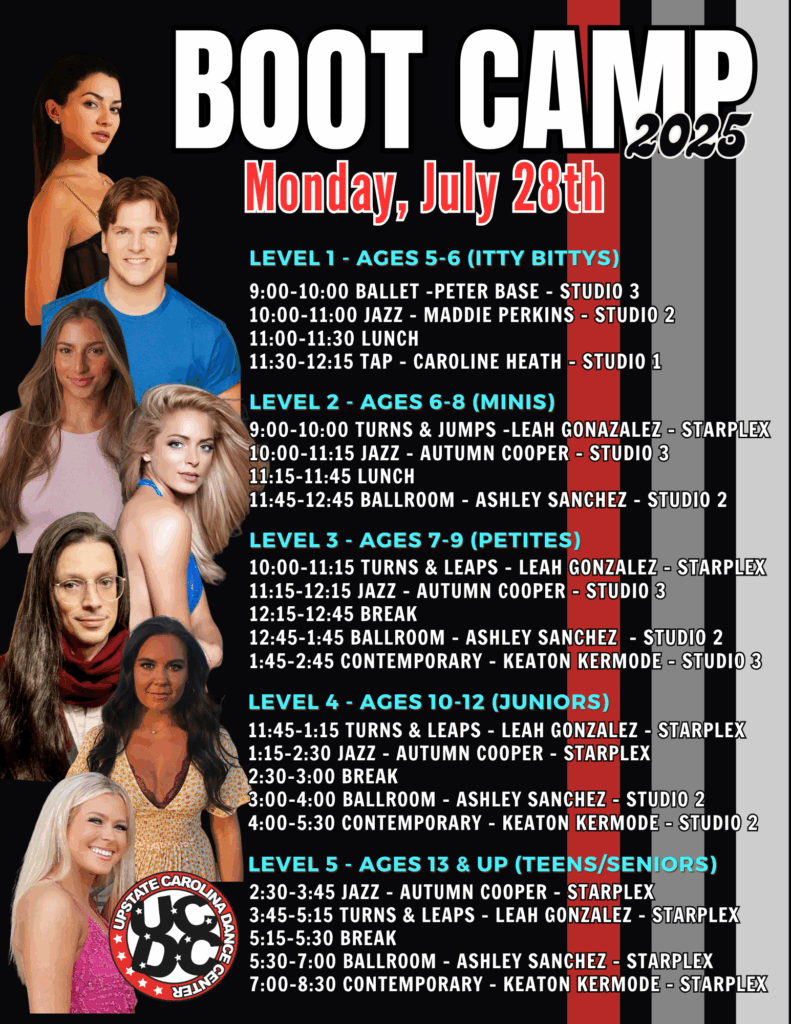 We are so excited to have you join us for our upcoming boot camp! Get ready for an unforgettable week of exceptional dance training, led by some truly amazing instructors who bring passion, talent, and energy to every class. Whether you’re here to refine your technique, challenge yourself, or simply enjoy the thrill of dancing, we hope you’re as excited as we are to kick things off. Be sure to check out the schedules below, and don’t forget to click on the registration form to secure your spot—spaces are limited!